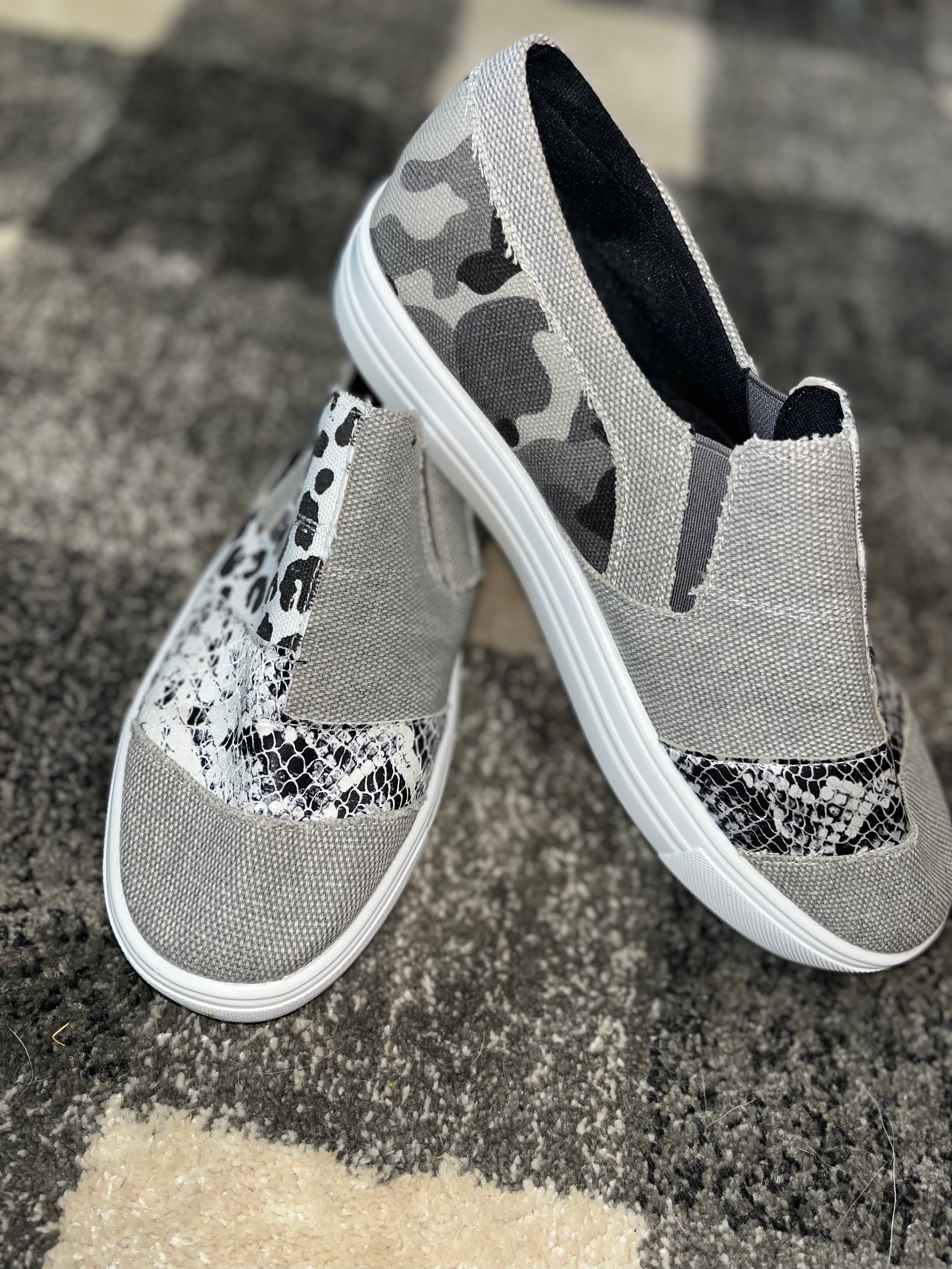 These cute slip on shoes have the gorgeous mix pattern of snakeskin, camo, and leopard print!